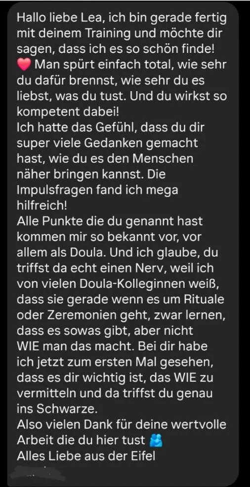 Und es ist mein Herzensanliegen, dieses Wissen weiterzugeben. So möchte ich Frauen stärken, die sich berufen fühlen, tiefgehende Räume für werdende Mütter zu halten.